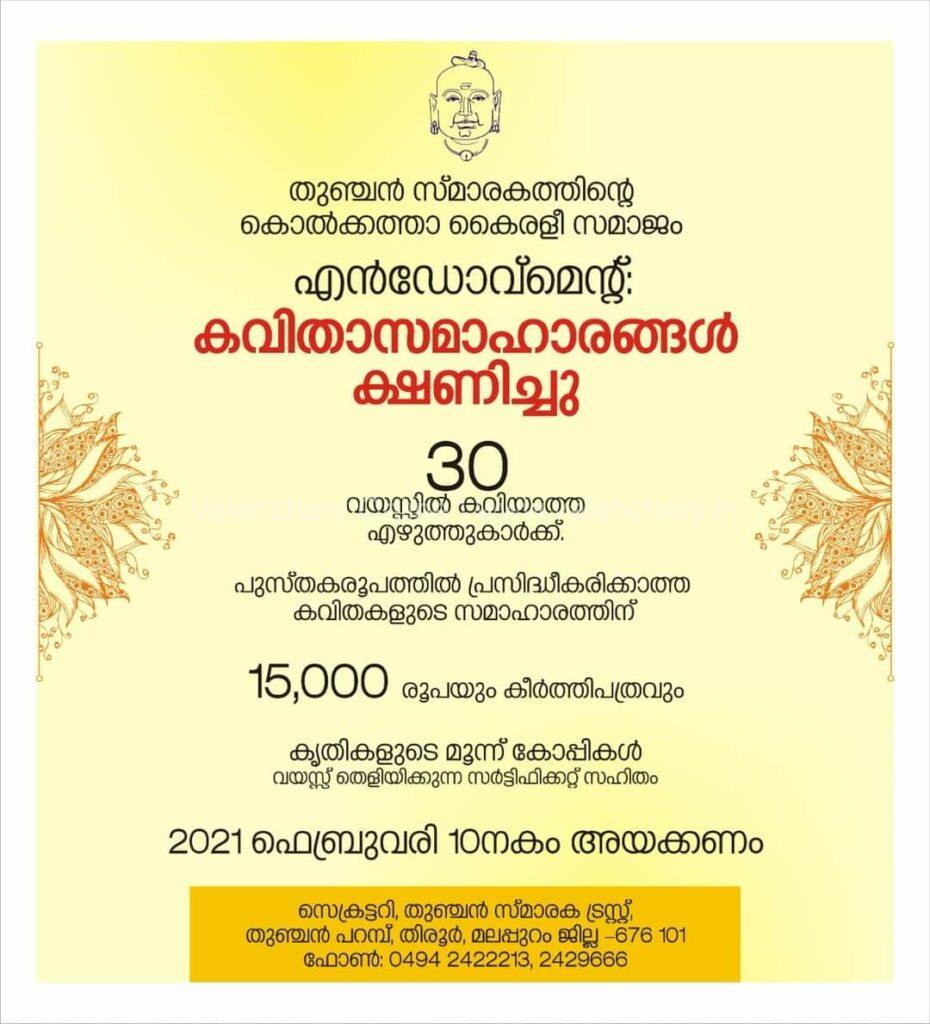 തുഞ്ചൻ സ്മാരകട്രസ്റ്റിന്റെ കൊൽക്കത്ത കൈരളീസമാജം എൻഡോവ്മെന്റ്; കവിതാസമാഹാരങ്ങൾ ക്ഷണിച്ചു