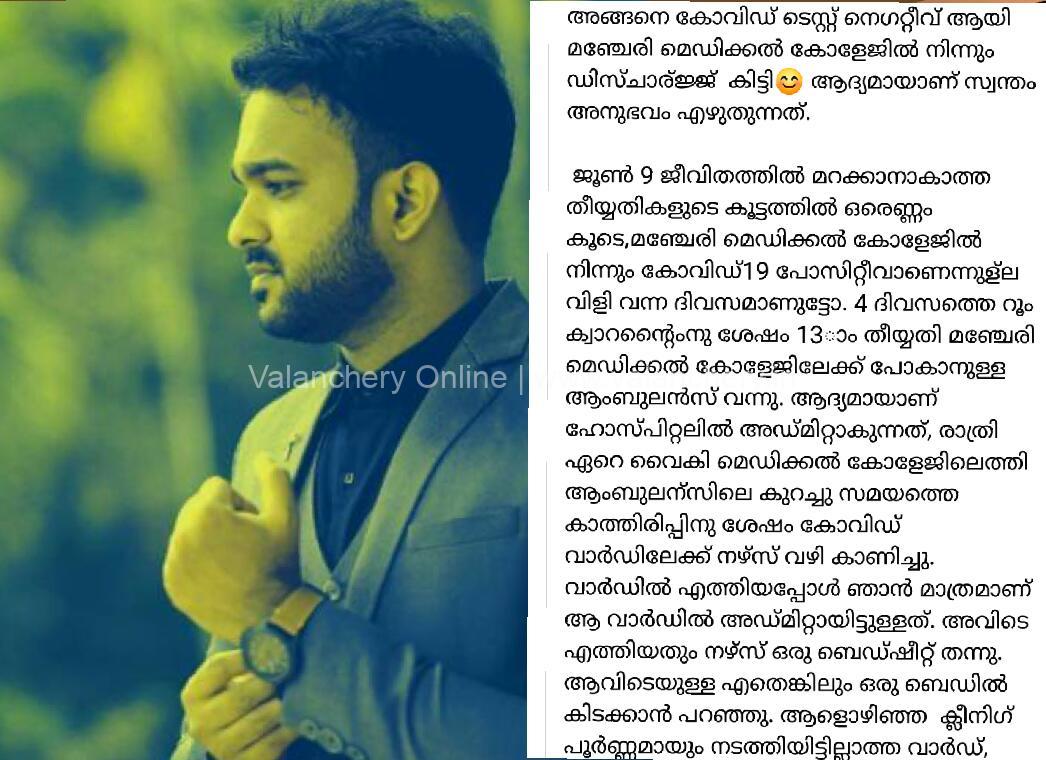 “അങ്ങനെ കോവിഡ് ടെസ്റ്റ് നെഗറ്റീവ് ആയി മഞ്ചേരി മെഡിക്കല് കോളേജില് നിന്നും ഡിസ്ചാര്ജ്ജ് കിട്ടി😊 ആദ്യമായാണ് സ്വന്തം അനുഭവം എഴുതുന്നത്.